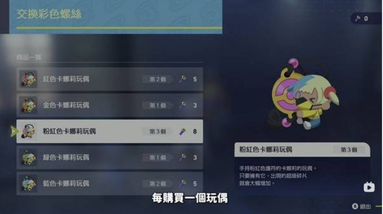 兑换粉红色卡娜莉玩偶,可以增加超级碎片的获取数量。