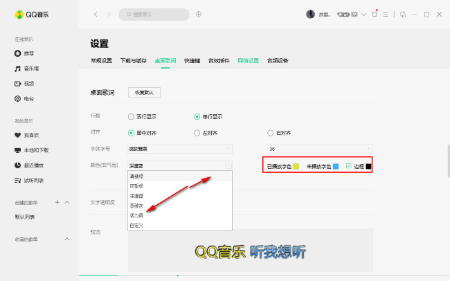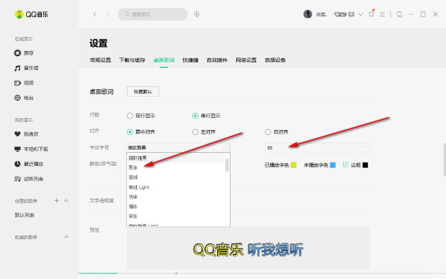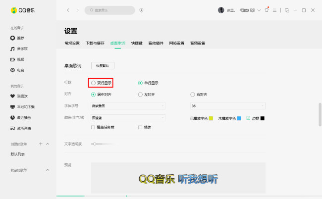 然后在下方中就可以对桌面歌词的行数、字体字号、颜色以及透明度进行相关的设置。