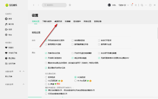 进入到新的窗口界面后,点击上方中的"桌面歌词"选项。