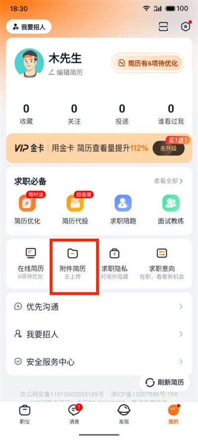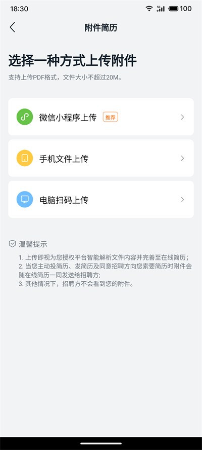 进入附件简历界面后,可以选择三种方式上传附件简历,用户根据自己的需求进行上传即可。