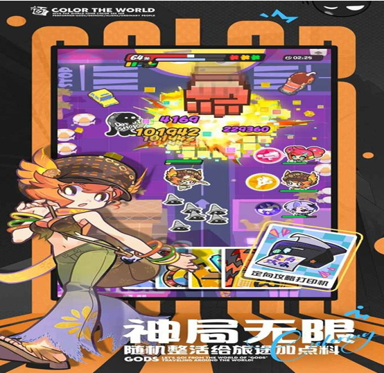 游戏融合竖屏弹幕射击与景点涂鸦交互玩法,包含自由女神像装导弹、金字塔撸黑猫等无厘头设计。特色系统涵盖神明伙伴共享养成、颜色标记技能及漫画式过场剧情,支持移动端与PC端双平台运行。