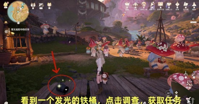 我们捡完铁桶后,跟随指引,到神女之家的上面一层找到橙色菇菇人,和它对话;