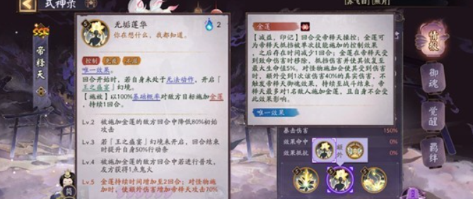 攻击敌方全体,造成伤害,可以使自己和生命最低的友方回血。如果金莲消失了,解除自身所有控制状态。免消耗释放一次三技能,不触发敌方御魂和被动。