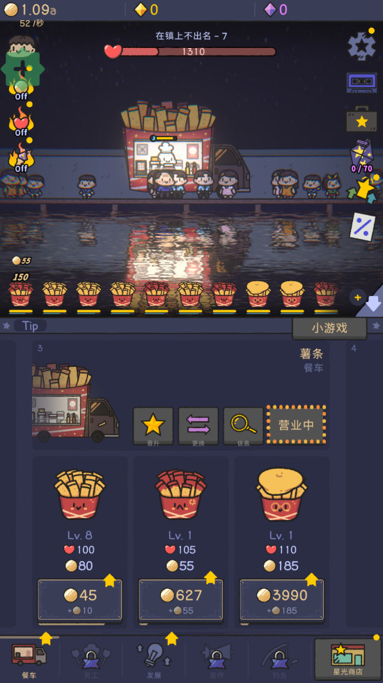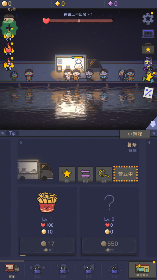 6、此外,还可以提升技能和解锁不同的员工获得更多的金币不断的解锁更多餐车扩大商业板块