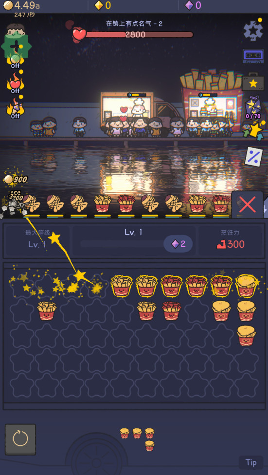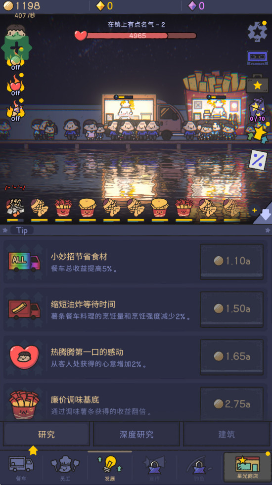 7、轻松享受的放置养成:即使游戏关闭,食物仍会售出,餐车依旧成长。随时进来休息一下,你的街道依然温暖闪耀。